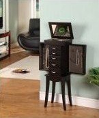 Black 5 Drawer Jewelry Armoire. Designed with sophistication in mind, the sides of this armoire take on a concave shape that continues to its tapered legs. It features five lined drawers with silver pull handles that nicely contrasts against the dark, high-quality exterior. Felt lined interiors complete the piece. Assembly Required
